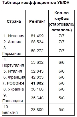После матчей второго квалификационного раунда Лиги чемпионов и Лиги Европы отставание Россия от Франции в таблице коэффициентов УЕФА сократилось до шести очков (1.001 балл).