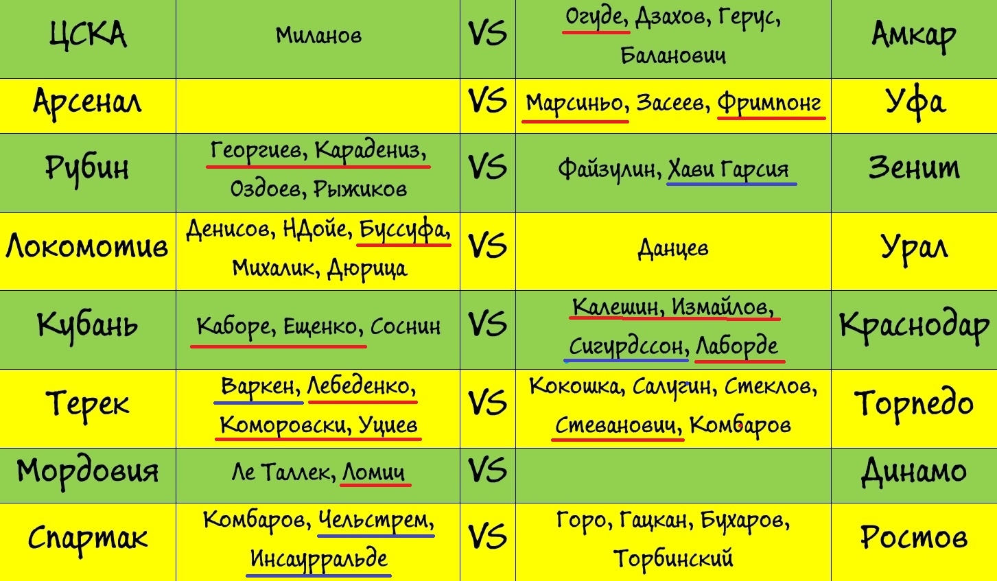 И 16 футболистов возможностью схватить дисквалификационный "горчичник" воспользовались - они подчёркнуты красным. Синим - те футболисты, которые в середине недели на поле не выходили. Посмотрим, какие матчи предстоящего тура более всего пострадают от карточек, полученных игроками посреди недели.