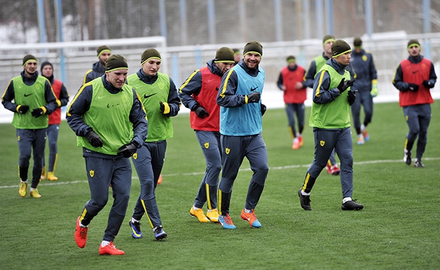 Игроки в течение 15 минут разминались в зале, а затем вышли на расчищенное от снега искусственное поле учебно-тренировочного центра "Сатурн". После получасовой беговой работы футболистов ждала игровая часть. В общей сложности тренировка заняла около часа с небольшим.