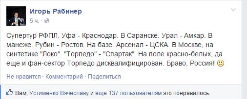 Супертур РФПЛ. Уфа - Краснодар. В Саранске. Урал - Амкар. В манеже. Рубин - Ростов. На базе. Арсенал - ЦСКА. В Москве, на синтетике "Локо". "Торпедо" - "Спартак". На поле красно-белых, да еще и фан-сектор Торпедо дисквалифицирован. Браво, Россия! «smile»