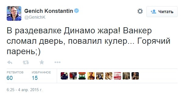 "В раздевалке "Динамо" жара! Ванкер сломал дверь, повалил кулер... Горячий парень", - написал Генич в своем твиттере.