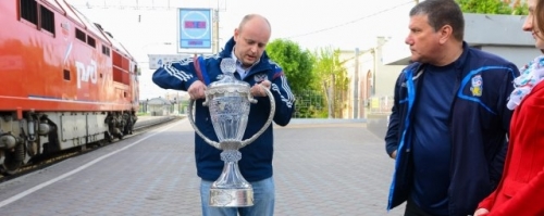 Привёз кубок на поезде главный специалист департамента безопасности и работы с болельщиками Дмитрий Кузюра.