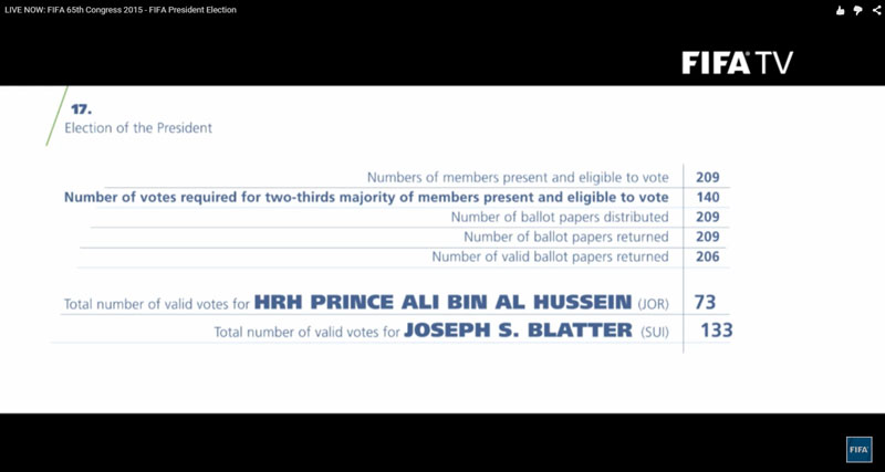 Принц Али набрал 73 голоса, Йозеф Блаттер - 133 голосов.