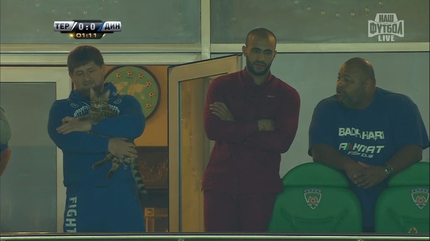 Но не с футболистами были связаны первые эмоции матча "Терек" - "Динамо". Кадр тура случился, когда камера обратил свой взор на ВИП-трибуну, где Рамзан Ахматович Кадыров начал смотреть футбол с котом на руках. Более милой и уютной картинки на старте встречи в Грозном придумать, кажется, было просто невозможно. Меж тем, события на поле не спешили перебивать на себя внимание зрителей. В первые полчаса ударов в створ команды не нанесли, а зрелище скорее напоминало не чемпионат России по футболу, а чемпионат России по подходам к воротам - вот этого было в матче предостаточно.