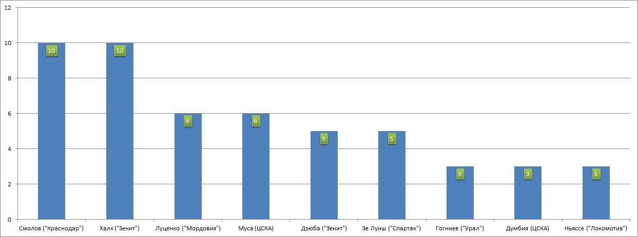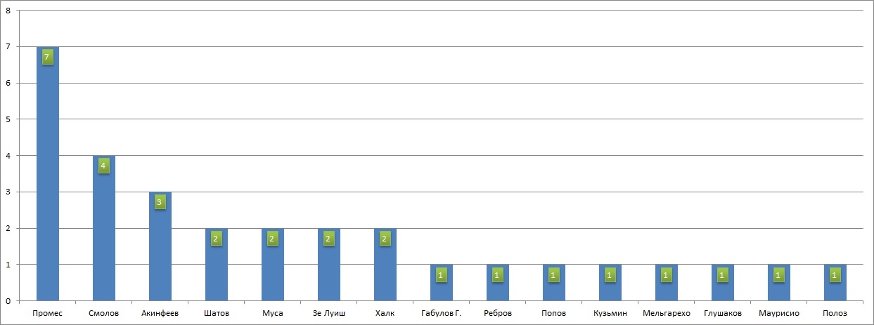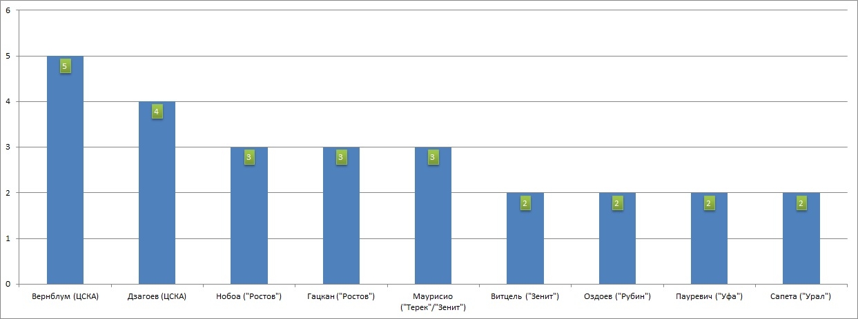 По 4 раза - Смольников ("Зенит"), Баштуш ("Ростов"), Боккетти ("Спартак"), Фонтанелло ("Урал");