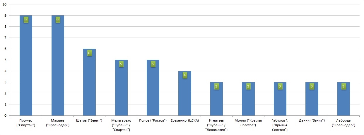 По 3 раза - Березуцкий А. (ЦСКА), Кудряшов ("Ростов"), Морозов ("Динамо"), Козлов ("Динамо"), Кузьмин ("Рубин"), Игнашевич (ЦСКА), Навас ("Ростов"), Рыков ("Мордовия"), Чорлука ("Локомотив");
