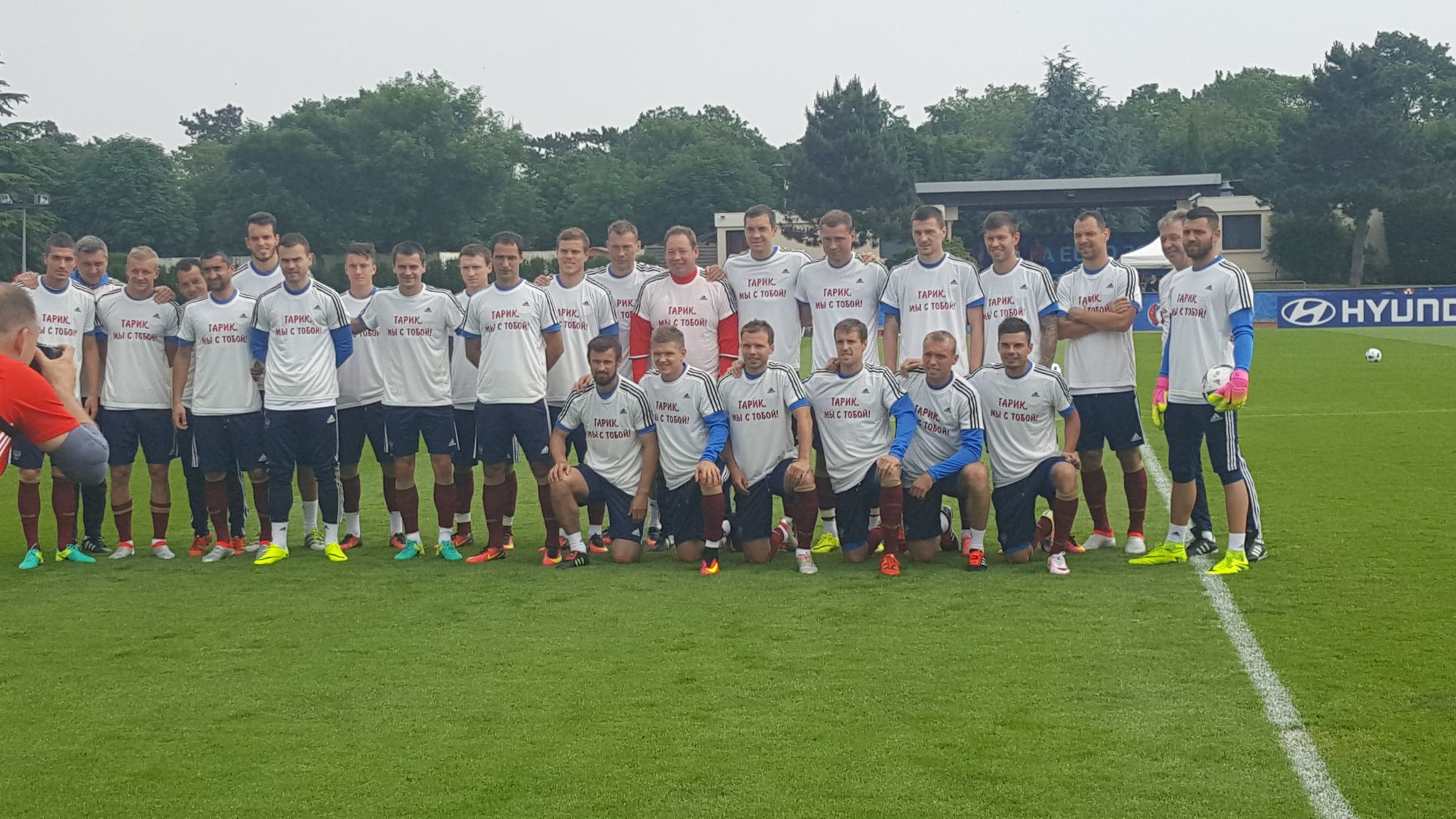Игроки сборной России вышли на сегодняшнюю тренировку в футболках с надписью "Гарик, мы с тобой" в поддержку полузащитника Игоря Денисова, который из-за травмы бедра, полученной в товарищеской встрече с командой Сербии (1:1), не сможет принять участие в предстоящем чемпионате Европы во Франции.
