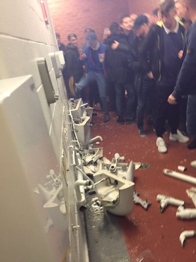 После матча, в Сеть просочились фотографии, показывающие, как группа приезжих болельщиков разгромила туалеты на домашней арене "Юнайтед".