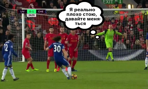 Денис Колодин пропал с радаров, но дело его живёт и процветает: пока Миньоле выстраивал стенку, а защитники «Ливерпуля» закрывали драгоценные места руками, Давид Луиз просто подбежал к мячу и гениально по нему саданул. Голкипер выглядел как человек, увидевший хвост поезда, который должен прибыть через 15 минут.