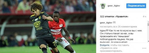 Защитник "Анжи" Георгий Тигиев, который близок к переходу в "Спартак", в своем инстаграме выложил фотографию с матча против красно-белых, на которой запечатлен он и полузащитник Квинси Промес.