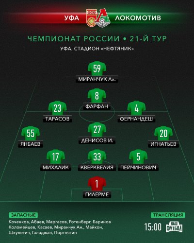 Джефферсон Фарфан - в стартовом составе "Локомотива" на игру с "Уфой" 1 апреля 2017 14:27 Пресс-служба "Локомотива" опубликовала стартовый состав команды на игру премьер-лиги с "Уфой". Подписывайтесь на новости футбола от Rusfootball.info в Telegram, Яндекс.Новостях и Гугл.Новостях. Все главные и интересные новости тут Гугл.Новости Яндекс.Новости Телеграм Локомотив