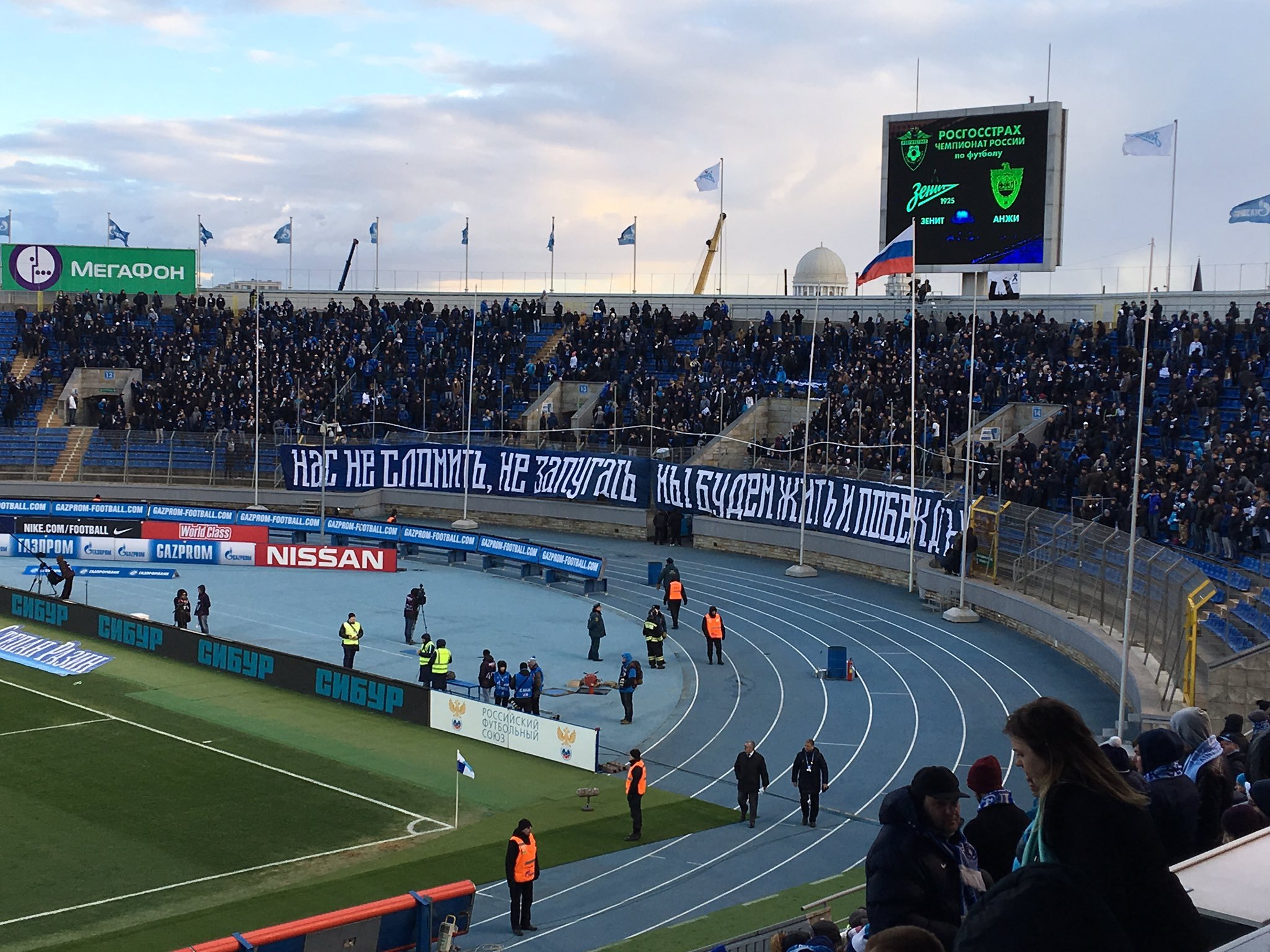 Болельщики "Зенита" подготовили баннер к матчу 22-го тура чемпионата России против "Анжи". Встреча началась с минуты молчания по поводу теракта в метро Санкт-Петербурга.