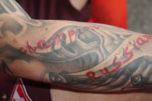 Тематика разнообразная. Рисунки, надписи. Например, в честь каждой своей команды звезду набиваю. Нанёс чемпионскую татуировку поверх старой, чтобы ярче выглядело. И на видном месте", - цитирует Ещенко "Чемпионат".