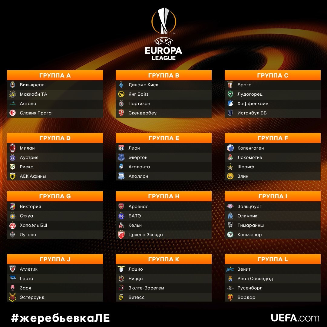 Корзина 1: «Арсенал», «Зенит», «Лион», «Динамо» Киев, «Вильярреал», «Атлетик», «Лацио», «Милан», «Виктория» Пльзень, «Ред Булл Зальцбург», «Копенгаген», «Брага».