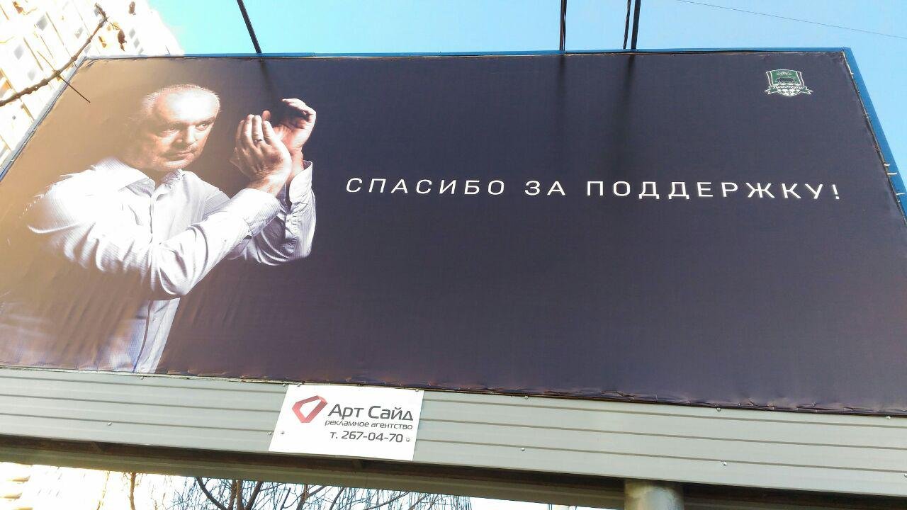 На билбордах изображен главный тренер "быков" Игорь Шалимов. Напомним, "горожане" по итогам осенней части сезона занимают 4-е место в таблице премьер-лиги, отставая от 2-ой строчки всего на одно очко.
