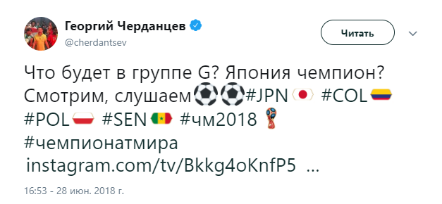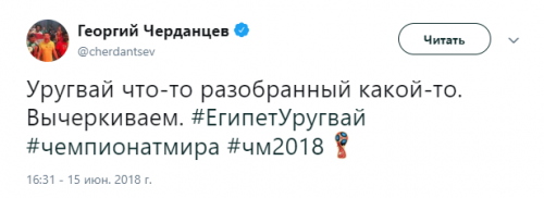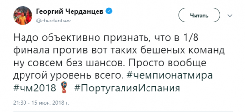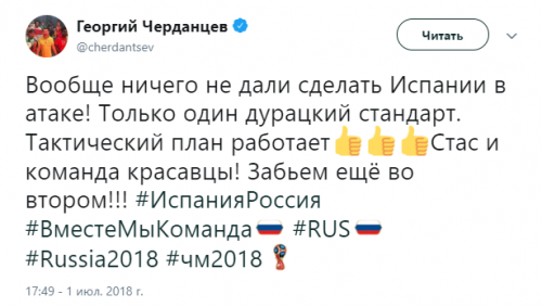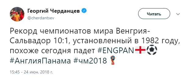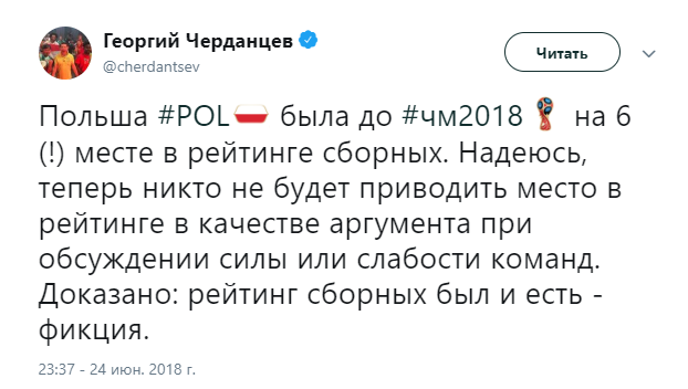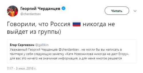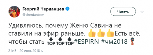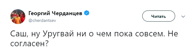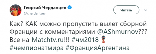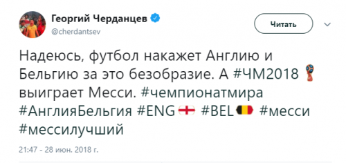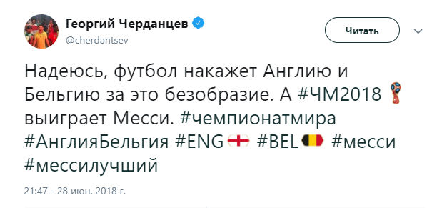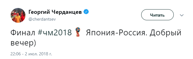 Твиттер смерти. Как Черданцев хоронит команды на Чемпионате Мира 3 июля 2018 11:47 Георгий Черданцев прославился своими прогнозами на Евро-16, когда они часто не сбывались. На этом Чемпионате Мира ничего не поменялось. Rusfootball.info предлагает подборку культовых предсказаний этого Мундиаля.Далеко прошли...Португалия и Россия уже вычеркнулиБез шансов, без вариантовДействительно, как они это делают!А потом был блистательный комментарий России с Уругваем в духе ГаззаеваПеру, скорбим!А рекорд был близокЯпонцы спаслись чудомА ведь "могли далеко пройти". Проклятый рейтингМесси уже дома. У Бельгии и Англии появились шансы на финалНаверное, какой-то другой матчА ведь могли не доводить до пенальти. Коротко о том, как похоронить Японию при 2:0Бонус:Виталий Поморцев. Rusfootball.info Подписывайтесь на новости футбола от Rusfootball.info в Telegram, Яндекс.Новостях и Гугл.Новостях. Все главные и интересные новости тут Гугл.Новости Яндекс.Новости Телеграм Георгий Черданцев Лионель Месси Сборная Франции Публикация: Нашли ошибку в статье? Напечатать | 11 +48