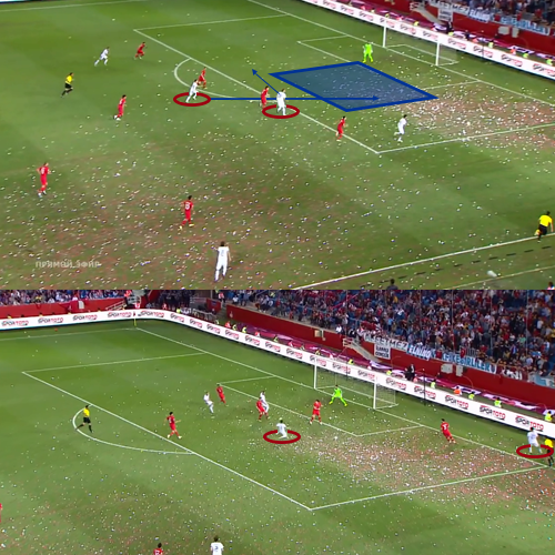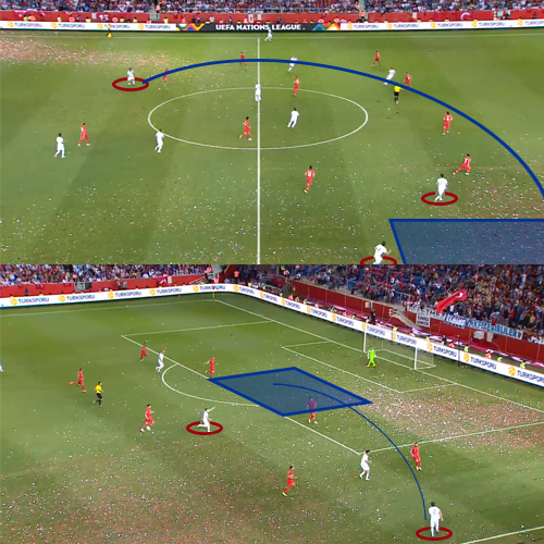 Эту же зону удалось вскрыть и в концовке первого тайма. Быстро выйдя из обороны в атаку за счет эффективных комбинационных взаимодействий на правом фланге, Марио Фернандес аккуратно покатил Далеру, который снова врывался в зону в правом полуфланге и опасно пробил в дальний угол:
