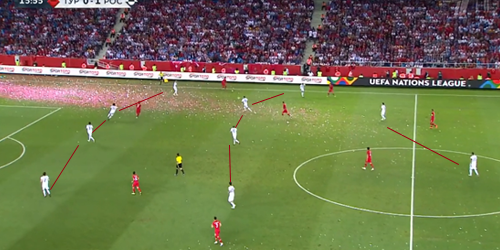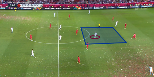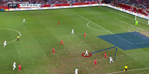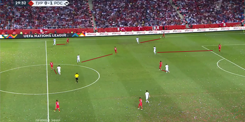 Еще в упомянутом выше июньском матче с турками команда Станислава Черчесова забила единственный мяч как раз после организованного прессинга во фланговой зоне. Тогда, и в дальнейшем на ЧМ этот элемент взаимодействий без мяча был отработан у команды на приличном уровне и сильно помог в достижении результата. В сегодняшней игре игроки вновь удачно использовали прессинг в таких ситуациях: