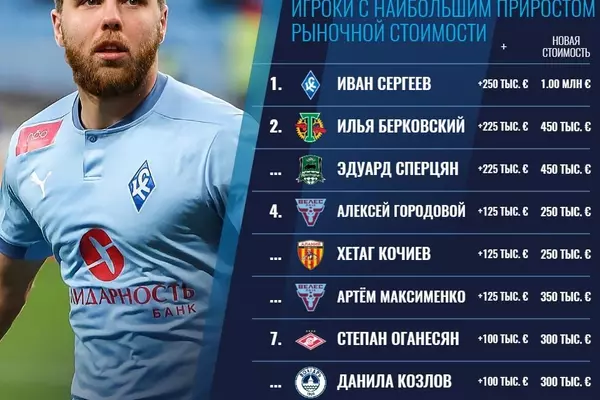 Тройку лидеров лиги составили Иван Сергеев ("Крылья Советов"), стоимость которого выросла на 250 тысяч евро, а также Илья Берковский ("Торпедо") и Эдуард Сперцян ("Краснодар-2"), которые прибавили по 225 тысяч. В топ-10 с приростом цены в размере 100 тысяч евро попал также форвард "Спартака" Степан Оганесян, дебютировавший за главную команду в 11 туре РПЛ в матче с "Химками".
