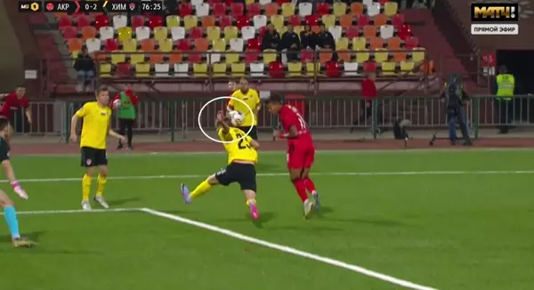 Игра на стадионе "Кристалл" в Жигулевске (Самарская область) завершилась со счетом 2:0 (2:0) в пользу гостей. На 76-й минуте арбитр игры Иван Сиденков допустил грубую ошибку в ключевом эпизоде. Мяч после скидки со стороны нападающего "Акрона" Андреса Понсе угодил в голову футболисту "Химок" Захару Волкову. Повторы с разных телекамер свидетельствуют, что мяч не коснулся ни одной из рук химчанина, однако рефери указал на "точку".