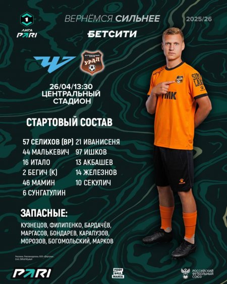 Стал известен состав "Урала" на матч 31-го тура Первой лиги.