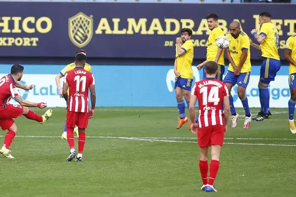 "Атлетико" продолжает лидировать в чемпионате Испании, набрав 50 очков. Их отрыв от "Реала", который занимает 2-е место, вырос до 10-и зачетных баллов. "Кадис" располагается на 13-й строчке с 24-я очками.