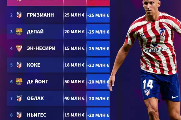 В список топ-10 игроков, которые, по данным аналитического футбольного портала Transfermarkt, больше всего подешевели в Ла Лиге вошли 6 футболистов мадридского "Атлетико". Также в рейтинге присутствуют два игрока "Барселоны" и один игрок "Севильи".