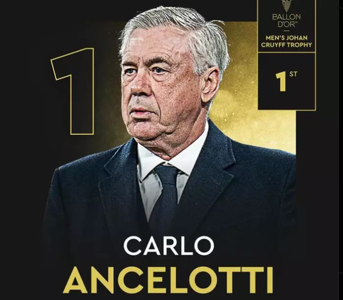 Карло Анчелотти не имел возможности принять награду самостоятельно. Делегация мадридского "Реала" в полном составе бойкотирует церемонию, предположительно, из-за несогласия с решением о невручении "Золотого Мяча" вингеру "сливочных" Винисиусу Жуниору.