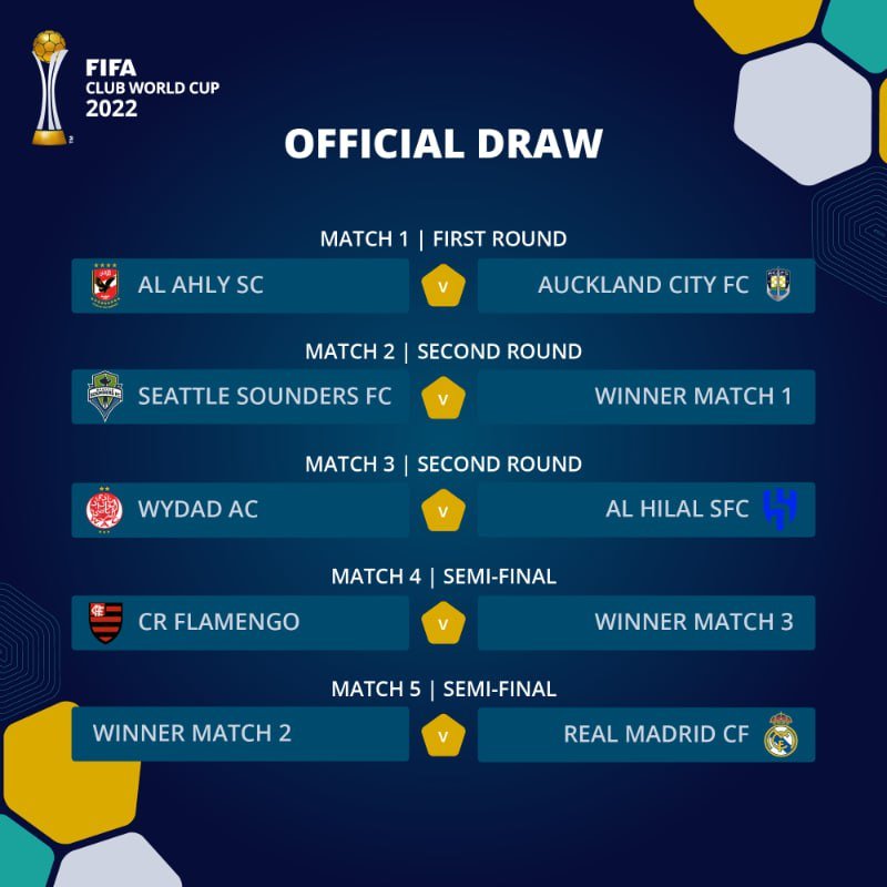 Прошла жеребьевка клубного чемпионата мира. "Реал" сыграет 8 февраля против команды из США, Египта или Новой Зеландии 13 января 2023 15:22 Состоялась жеребьевка клубного чемпионата мира-2022, который пройдет в Марокко c 1 по 11 февраля 2023 года.