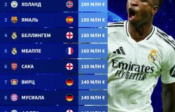 Винисиус и Холанд стали самыми дорогими футболистами по итогам 2024 года 30 декабря 2024 15:16 Интернет-портал Transfermarkt опубликовал список самых дорогих футболистов в мире.