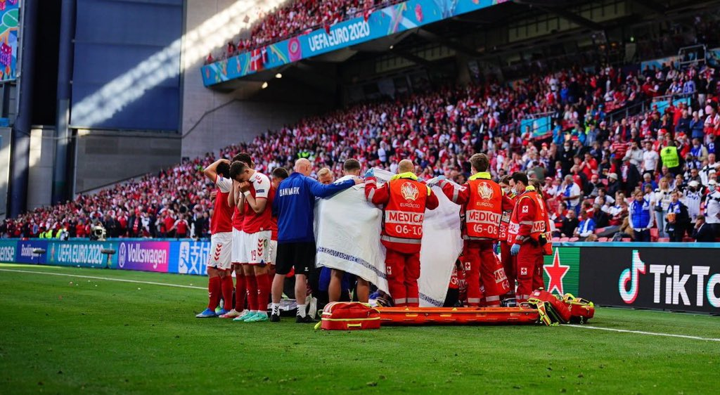 Полузащитник сборной Дании Кристиан Эриксен потерял сознание во время матча с командой Финляндии на Евро-2020.