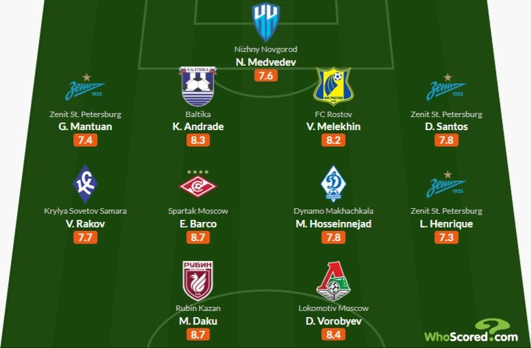 Барко, Даку и три игрока "Зенита" вошли в символическую сборную 7-го тура РПЛ от WhoScored 1 сентября 2025 20:08 Whoscored представил сборную лучших футболистов минувшего тура чемпионата России.