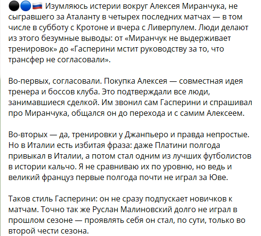 "Даже Платини полгода привыкал, а потом стал одним из лучших в истории Серии А". Арустамян - о Миранчуке 4 ноября 2020 20:45 Инсайдер Нобель Арустамян поделился мнением о ситуации полузащитника Алексея Миранчука в "Аталанте".
