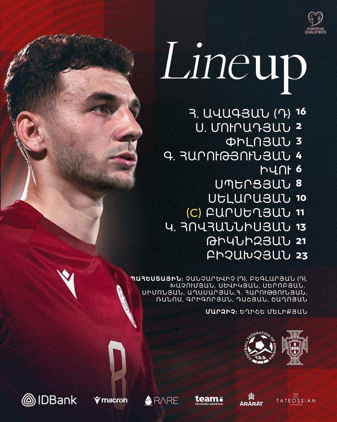 Полузащитник "Краснодара" Эдуард Сперцян вышел в стартовом составе на матч против сборной Португалии в рамках отборочного цикла на чемпионат мира-2026 года.