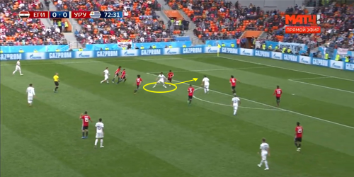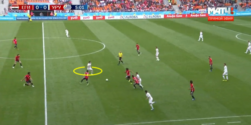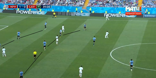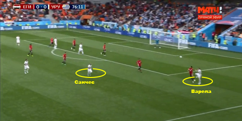 Уругвай пока не впечатляет. Разбор игры соперника сборной России 20 июня 2018 22:39 Сегодня сборная Уругвая с минимальным счетом обыграла сборную Саудовской Аравии, что окончательно гарантировало выход сборной России из группы. Теперь впереди у нашей команды матч с по-настоящему серьезным соперником. Rusfootball.info анализирует игру сборной Уругвая на чемпионате мира и оценивает перспективы противостояния за первое место в группе А. Надо понимать, что и сборная Египта, и сборная Саудовской Аравии сыграли с уругвайцами гораздо сильнее, чем со сборной России. Кроме того, на протяжении всей игры с аравийцами складывалось ощущение, что Уругвай, как и подобает топовой команде, пока еще входит в игровой тонус. Такое чувство, будто подготовка команды к турниру изначально была организована таким образом, чтобы команда вышла на пик формы уже к 3-му туру и матчам плей-офф. Тем не менее, оба матча продемонстрировали определенные закономерности в игре команды Оскара Табареса.1) Центральная зонаНа протяжении предыдущих мировых первенств уругвайцы традиционно выделялись сильной и по именам, и по качеству атакой, достаточно крепкой обороной и невзрачной полузащитой. Ни в ЮАР, ни в Бразилии в составе команды не было полузащитников по-настоящему высокого уровня. В Россию же «небесно-голубые» привезли одну из самых интересных центральных зон, состоящую из молодых, перспективных и, главное, умных центральных полузащитников. В обеих играх на ЧМ сборная Уругвая выходила играть по схеме 4-4-2, где в центре поля фигурировали полузащитники «Ювентуса» и «Интера» - Родриго Бетанкур и Матиас Весино. Важно, что в игре с Египтом оба выдали примерно одинаковые цифры по количеству и качеству передач: 87 передач с точностью 93% у Бетанкура, 85 передач (85.9% точность) – у Весино.В игре же с саудовцами роли игроков были четко распределены в построениях команды: Весино часто опускается вниз для розыгрыша мяча и начинает атаки, а Бетанкур обеспечивает динамику и чаще выбрасывается в прессинг, что также сказалось на статистике. Несмотря на превосходство Родриго по общим цифрам (80 передач против 63), Матиас отдал гораздо больше длинных передач (7 против 2). Вот типичный пример игры Весино в сегодняшнем матче:В целом, нужно отметить, что оба игрока отлично обращаются с мячом, правильно располагаются и много двигаются без мяча. Игроки чувствуют зоны между линиями и не дают соперникам достаточно времени и пространства для обострения игры в центральной зоне:2) Игра фланговых полузащитниковВ первом матче у уругвайцев в старте вышли играть Нандес (правее) и Арраскаета (левее). При этом левый полузащитник часто смещался в центральную зону для розыгрыша мяча накоротке, что отразилось и на вышеупомянутых действиях опорников команды. Тем не менее, при таком расположении Уругвай испытывал серьезные проблемы с построением атак в первом тайме, т.к. опорные полузащитники египтян располагались максимально близко к линии обороны и не давали строить атаки через центральную зону. Именно поэтому во втором тайме на поле вышли Кристиан Родригес (на левый фланг) и Карлос Санчес (на правый). Такой ход существенно повлиял на активность флангов уругвайцев и позволил отодвинуть игру на чужую половину поля. Так, например, Карлос Санчес часто принимал мяч в правом полуфланге и движением в центр открывал б