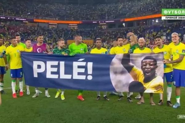 Игроки сборной Бразилии вынесли плакат в поддержку Пеле после победы над Южной Кореей 6 декабря 2022 00:38 Сборная Бразилии разгромила Южную Корею в матче 1/8 финала чемпионата мира в Катаре – 4:1. Скриншот: "Матч ТВ" После окончания встречи футболисты "пентакампеонов" вышли на поле с плакатом, на котором изображен Пеле, и сделали с ним командное фото.В конце ноября стало известно, что Пеле был госпитализирован в Сан-Паулу. В СМИ сообщалось, что легендарный экс-футболист не реагирует на химиотерапию. Врачи сообщали, что состояние Пеле стабилизировалось.9 декабря Бразилия сыграет со сборной Хорватии в четвертьфинале ЧМ-2022. Подписывайтесь на новости футбола от Rusfootball.info в Telegram, Яндекс.Новостях и Гугл.Новостях. Все главные и интересные новости тут Гугл.Новости Яндекс.Новости Телеграм Сборная Бразилии Сборная Южной Кореи Пеле Автор: Нашли ошибку в статье? Напечатать | 2 +2