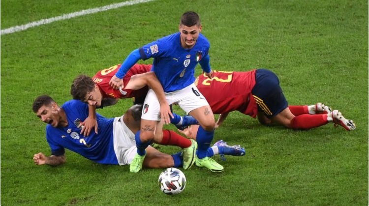 Карасев остудил пыл горячих итальянцев. Удаление в первом тайме и шесть предупреждений в полуфинале Лиги наций 7 октября 2021 07:30 Матч 1/2 финала Лиги наций Италия – Испания завершился со счетом 1:2, в финал пробились подопечные Луиса Энрике. На игре работала российская бригада рефери под руководством Сергея Карасева. Наши на «Сан-Сиро»Первый полуфинальный матч Лиги наций Италия – Испания, достаточно интересный и сам по себе, имел дополнительную причину привлечь внимание российского болельщика: на матч были назначены отечественные арбитры Сергей Карасев (главный рефери), его постоянные помощники Игорь Демешко и Максим Гаврилин в качестве лайнсменов и Сергей Иванов в роли резервного.Авторитет Карасева на международном уровне растет – в этом году Сергей и его бригада уже не раз работали на статусных матчах. Три игры на Чемпионате Европы (две в группе и 1/8 финала) плюс еще три встречи резервным лично для Карасева (в том числе четвертьфинал и полуфинал), поединок за Суперкубок УЕФА «Челси» – «Вильярреал», матч Лиги чемпионов «Порту» – «Ливерпуль» (не считая пары матчей квалификации ЛЧ) – шикарное резюме для отрезка в каких-то несколько месяцев. Поскольку в международных встречах, в отличие от некоторых внутрироссийских, Карасев работает уверенно и безошибочно, УЕФА без опаски поручает ему новые важные и сложные задачи.Матч между сборными Италии и Испании на миланском стадионе «Сан-Сиро» за выход в финал Лиги наций стал новой проверкой высшего уровня для российского арбитра, который не становится на колени в поддержку сомнительных зарубежных предматчевых акций (чего на этот раз, впрочем, от него никто и не требовал – BLM на европейских футбольных матчах сейчас проводится только при участии британских клубов или сборных).Первый тайм: три желтых карточки и удалениеКарасев начал встречу в привычной для его международных матчей манере, спокойно и уверенно. Единоборства трактовал по всем канонам современного европейского арбитра – позволял бороться, не разрывая игру на куски многочисленными свистками, в то же время не пропуская явных фолов. При этом не разбрасывался с первых минут желтыми карточками, что было характерно для этого рефери в первые годы его работы на высоком уровне, а проводил с нарушителями правил воспитательно-разъяснительную работу.Первое предупреждение Карасеву пришлось предъявить на 30 минуте игры. К этому времени итальянцев, успевших пропустить от Феррана Торреса на 17 минуте, начали захлестывать эмоции. После штрафного у испанских ворот, который футболисты сборной Италии разыграли через пас низом в штрафную площадь, Николо Барелла нарушил правила в атаке – однако свисток Карасева по этому поводу страшно не понравился капитану «скуадра адзурры» Леонардо Бонуччи, который с эмоциями кинулся к арбитру доказывать ошибочность такого решения. По современным канонам, желтая карточка в таких ситуациях является обязательной – она и была показана.Этот эпизод, как оказалось, предопределил исход всего матча – недисциплинированность очень сильно аукнулась капитану Бонуччи и его команде. На 41 минуте Леонардо в верховой борьбе ударил локтем в горло Серхио Бускетса – и арбитр просто не имел права в этой ситуации не показать ему желтую карточку, ставшую второй, как ни умоляли его не делать этого игроки сборной Итали