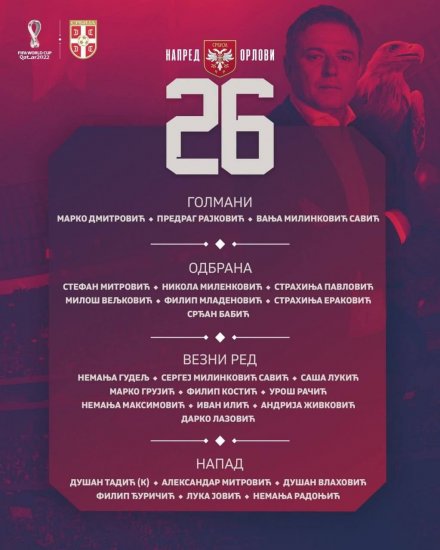 Сборная Сербии опубликовала заявку на ЧМ-2022 11 ноября 2022 16:49 Стал известен состав сборной Сербии на ЧМ-2022. Фото: Getty Images Сборная Сербии опубликовала заявку команды в своих социальных сетях. В состав включили 26 игроков.Сербия попала на ЧМ-2022 в группе G, где сыграет с национальными командами Бразилии, Камеруна и Швейцарии. Свой первый матч команда Драгана Стойковича проведет 24 ноября против сборной Бразилии. На предыдущем Чемпионата мира, который проходил в России в 2018 году, сборная Сербии заняла третье место в группе и не попала в плей-офф. Подписывайтесь на новости футбола от Rusfootball.info в Telegram, Яндекс.Новостях и Гугл.Новостях. Все главные и интересные новости тут Гугл.Новости Яндекс.Новости Телеграм Сборная Сербии Чемпионат Мира Опубликовал: Игнат Заздравин Нашли ошибку в статье? Напечатать | 1 +1