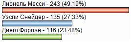 И читатели Русфутбол.инфо могут гордиться тем, что оказались прозорливее журналистов ведущей спортивной газеты Италии! Верно предсказали они и исход голосования тренеров, игроков и журналистов ФИФА (см. справа).Rusfootball.info поздравляет Лионеля Месси, Марту и лауреатов года в других номинациях – лучшего тренера Жозе Моуринью, автора самого красивого гола по результатам опроса на сайте ФИФА Хамита Алтынтопа и вошедших (помимо Месси, Хави и Иньесты) в символическую сборную мира Икера Касильяса ("Реал", Испания), Карлеса Пуйоля, Херарда Пике, Давида Вилью (все – "Барселона", Испания), Лусиу, Майкона (оба – "Интер", Бразилия), Уэсли Снейдера ("Интер", Голландия), Криштиану Роналду ("Реал", Португалия) – с заслуженными наградами!