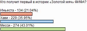 Всеведущая итальянская La Gazzetta dello Sport еще до Нового года где-то и как-то проведала, что первый в истории FIFA Ballon d’Or присужден Хави. Если так, то мнение читателей Русфутбол.инфо (см. скриншот справа), в ноябре-декабре 2010 года в два этапа определивших лучшую тройку игроков 2010 года и назвавших лучшим из лучших Месси, несколько разошлось со мнением участников голосования ФИФА. Но на то он и плюрализм мнений. Подождем результатов?..Победители