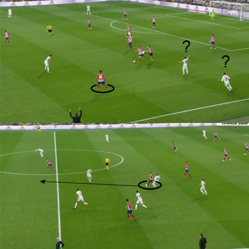 Эти проблемы отразились на стартовом составе и вместе с тем на атакующей активности левого фланга. Заменивший бразильца Начо - более оборонительный футболист, поэтому атаки «Реала» чаще строились через правый фланг Карвахаля (по крайней мере, в первом тайме). Как показалось, основная задумка Лопетеги была в том, чтобы максимально растянуть оборонительные линии «Атлетико» за счет высокой игры правого защитника и открывать полуфланг для смещений Бэйла под левую ногу.