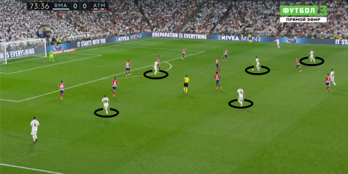 На второй тайм «Реал» вышел без одной из главных своих звезд. Гарет Бэйл получил повреждение, из-за которого пропустит матч с ЦСКА. Вместо него на поле «Сантьяго Бернабеу» вышел Дани Сэбальос. Парадоксально, но такие перестановки пошли на пользу команде в игровом плане. Асенсио стал чаще появляться на правом полуфланге, а Сэбальос расположился в левой полуфланговой зоне. С учетом активных подключений Модрича и Крооса, а также при помощи Бензема в оттяжке, «Реал» стал грамотно насыщать зону перед штрафной соперника: