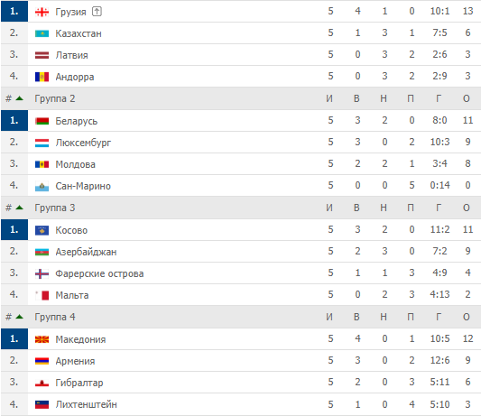 Из Лиги D вылетать некуда, поэтому пробежимся по лидерам, которые получат реальную уникальную для себя возможность выйти на Евро-2020, выиграв в плей-офф у себе подобных. Отлично турнир провела Грузия – преимущество над казахами и латышами впечатляет. Казахстану вновь стоит задуматься о переводе в азиатскую конфедерацию, хотя еврокубки отталкивают от этого шага.