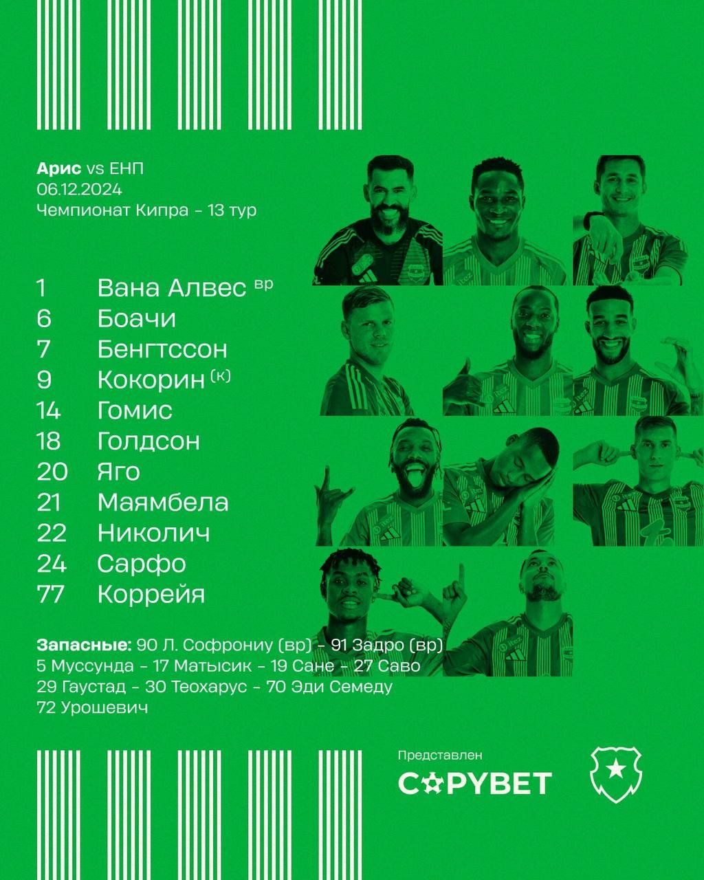 Отметим, российский форвард Александр Кокорин выведет "Арис" на поле в качестве капитана.